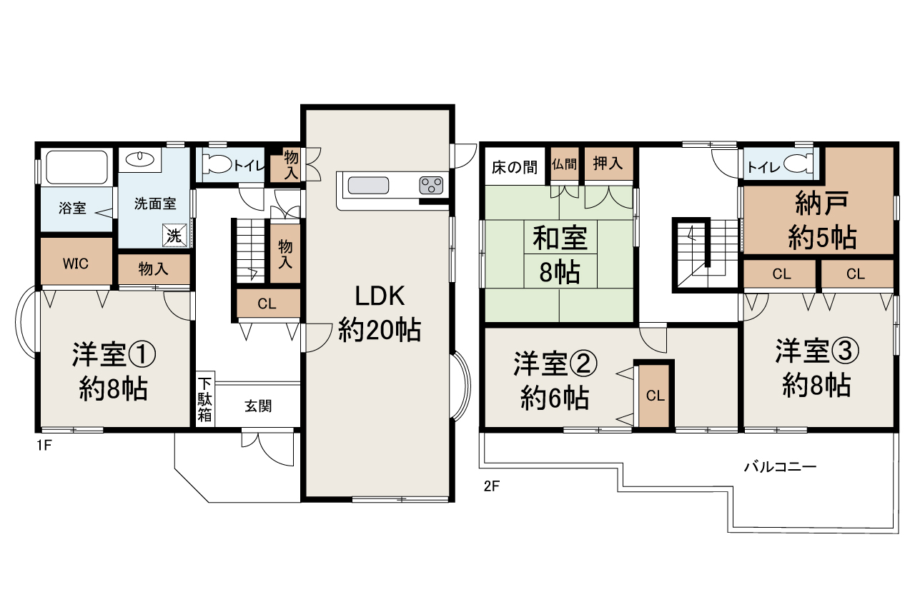 2階洋室からそれぞれ出入りできるバルコニー。南向きで日当り良好です。