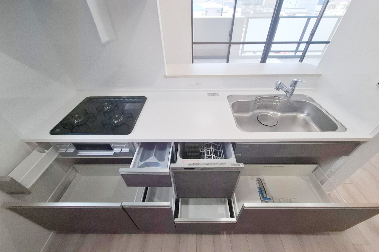 食洗機・浄水器付の家事がはかどる高機能キッチンは新調済み。ディープグレーのカラーがスタイリッシュ。