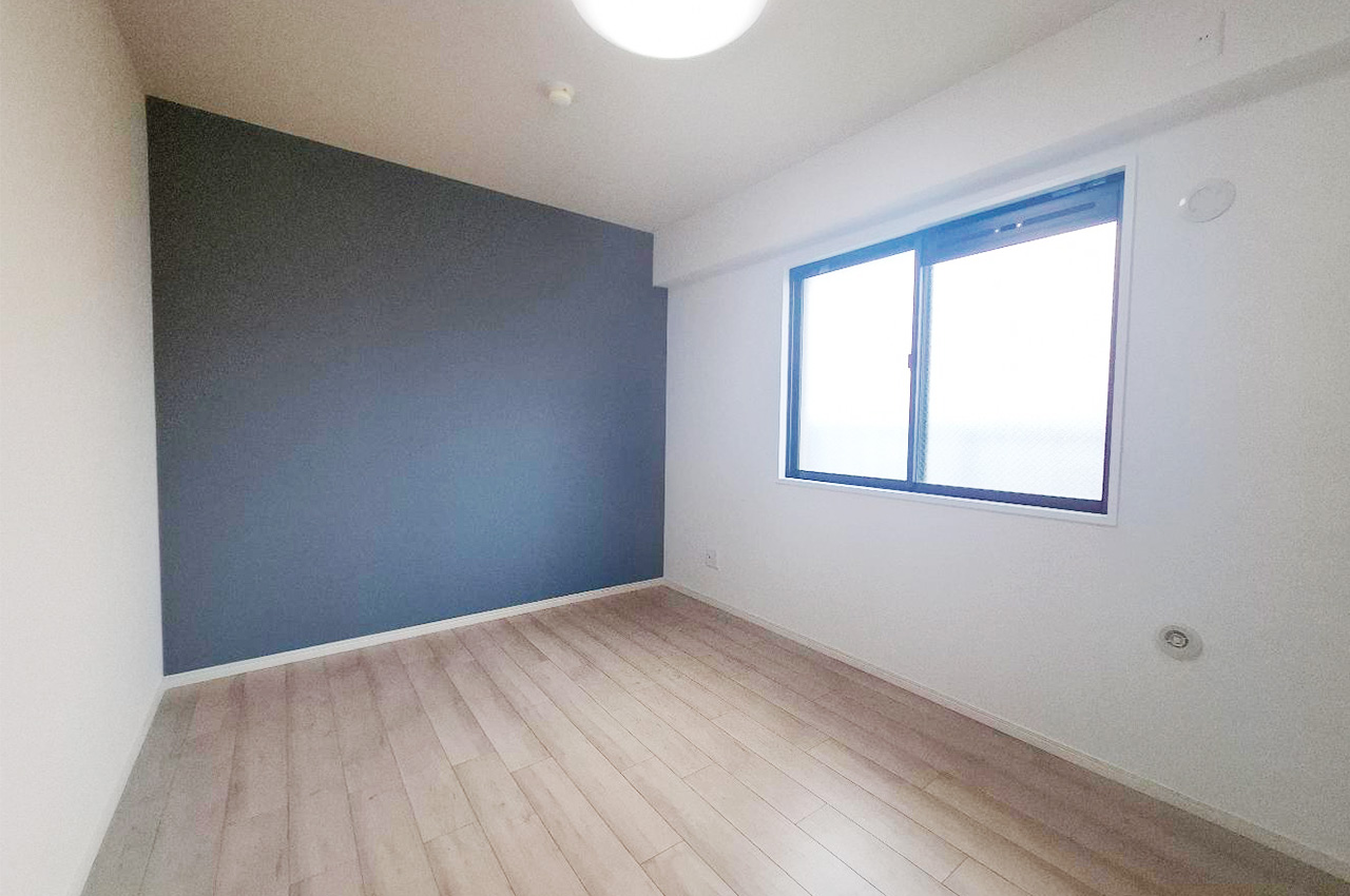 リフォームできれいに生まれ変わった洋室①。ブルーグレーのアクセントクロスが上質な雰囲気を演出します。