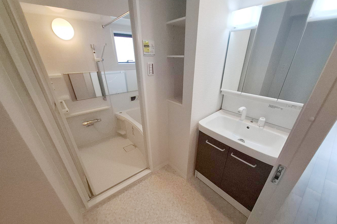 洗面台には大きな三面鏡があり身支度が快適に。床や天井クロスは貼り替え済みでピカピカ♪