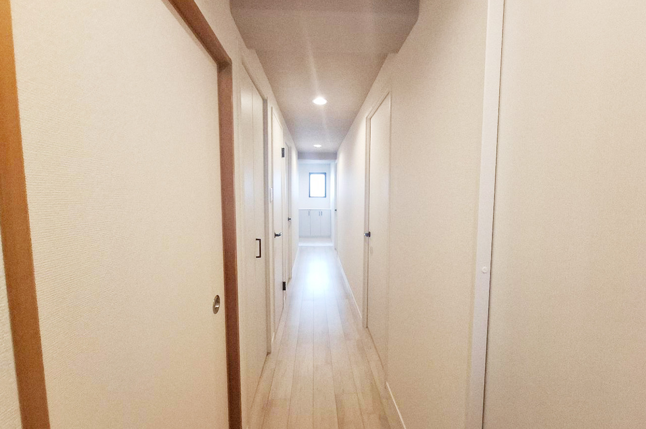 廊下にも玄関横の窓から光が差し、明るく気持ちのいい廊下。リフォーム済みで清潔感あり。
