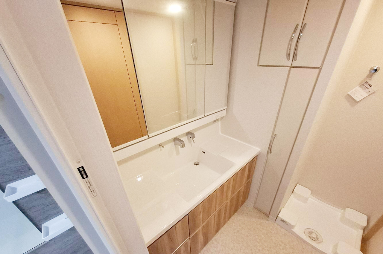 洗面:収納力のあるキャビネット付き。タオルや日用品をしっかり収め、すっきり暮らせる工夫があります。