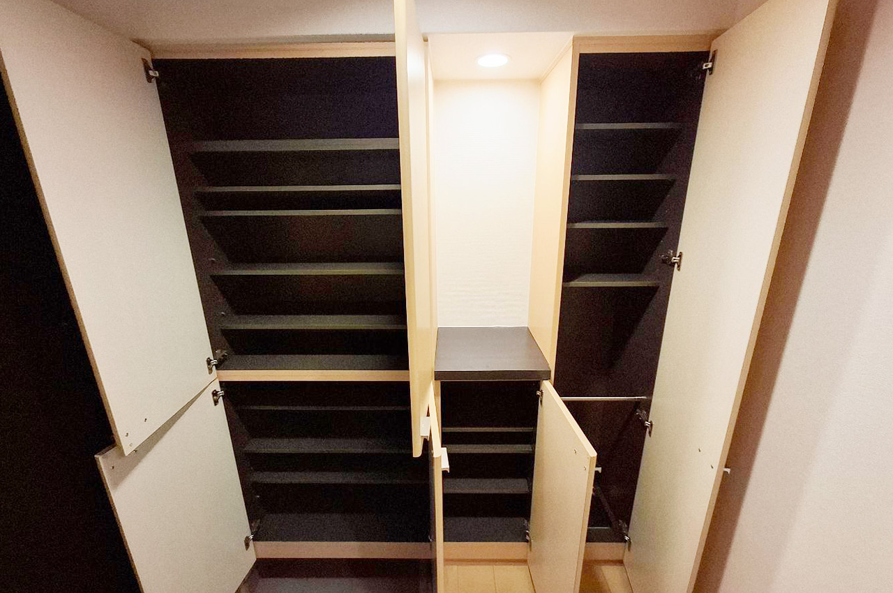 玄関:大容量の下駄箱収納を備えた玄関。靴や傘などをすっきり整理でき、いつでもきれいな空間を保てます。