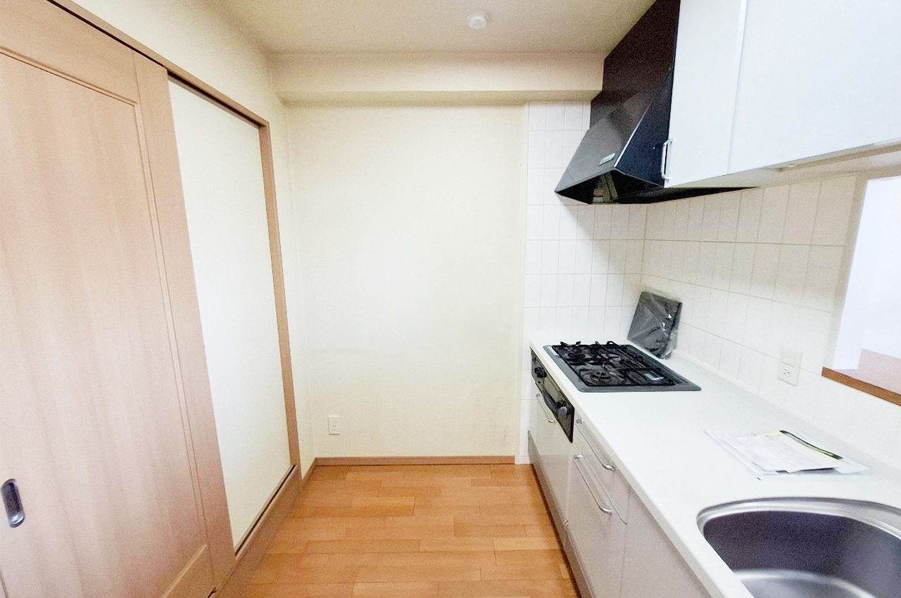 白を基調とした清潔感のあるシステムキッチン。上下に収納も充実しています。