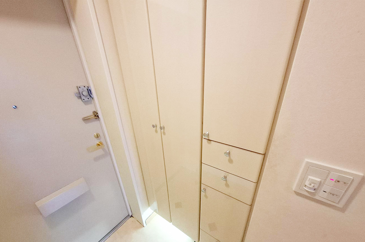 大型収納付きで整理整頓しやすい機能的な玄関。下駄箱+収納棚で靴や小物をしっかりと収納できます。