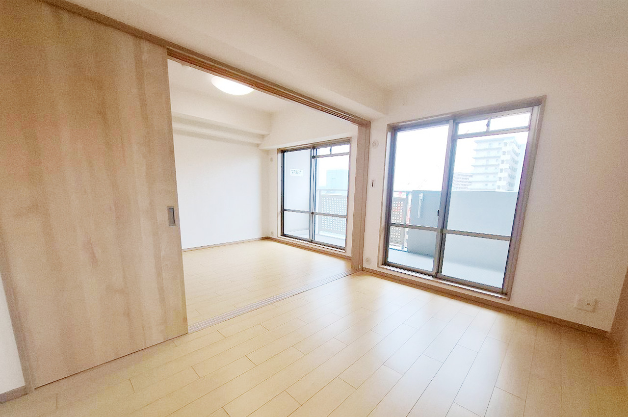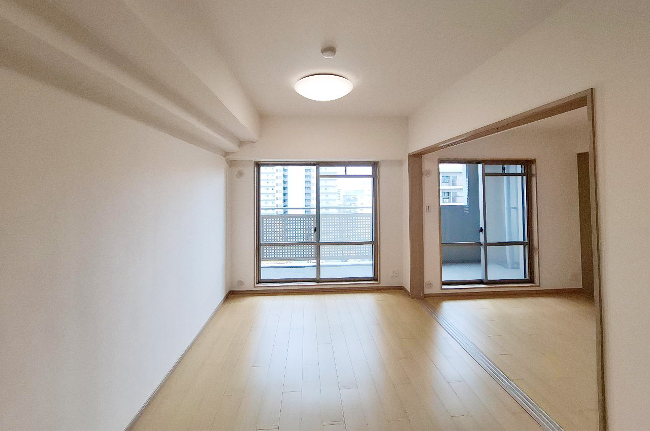 南西向きに面した明るく開放的なリビングと洋室。クロスやフローリングを貼替えいっそう明るくなりました。
