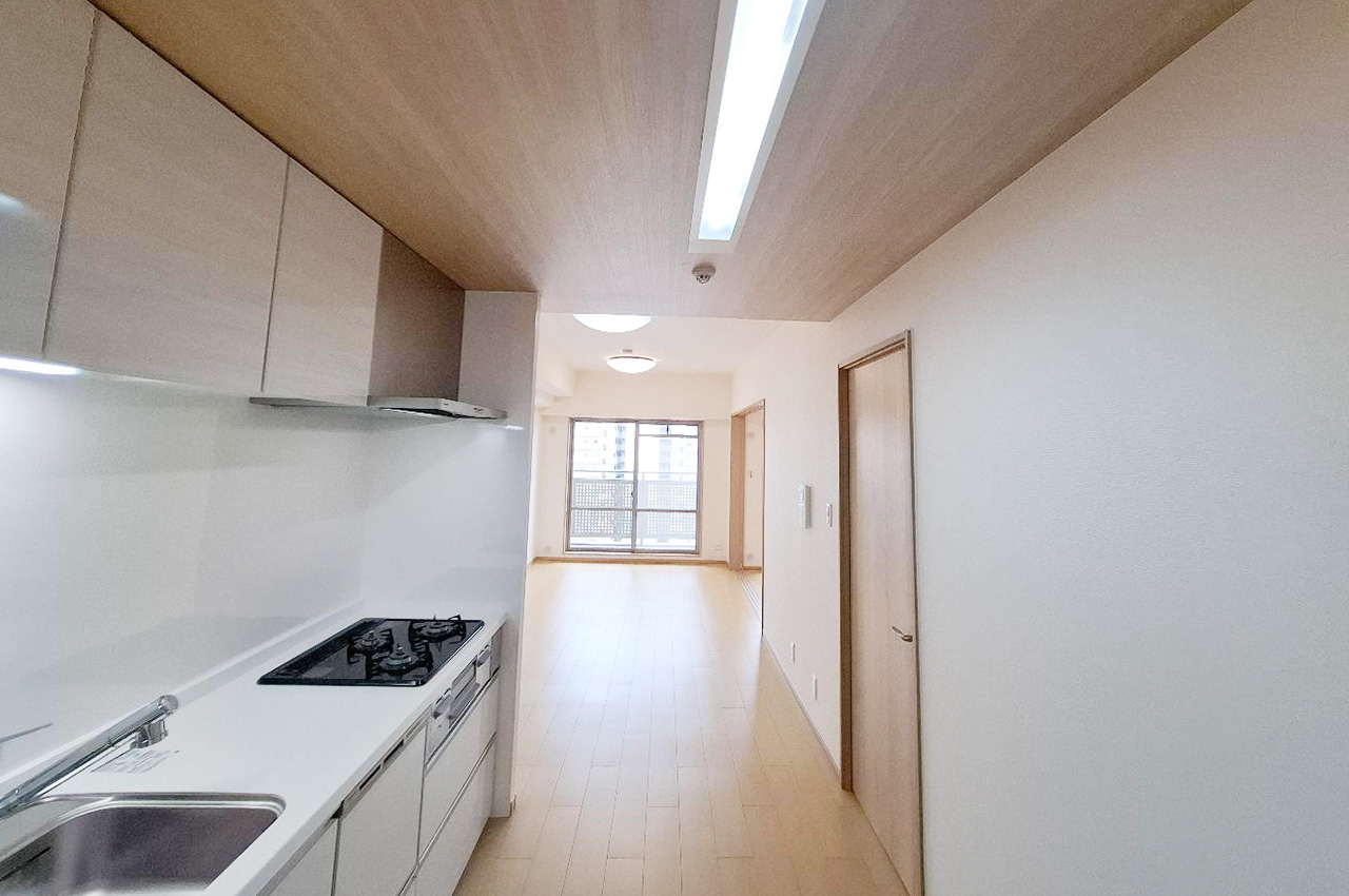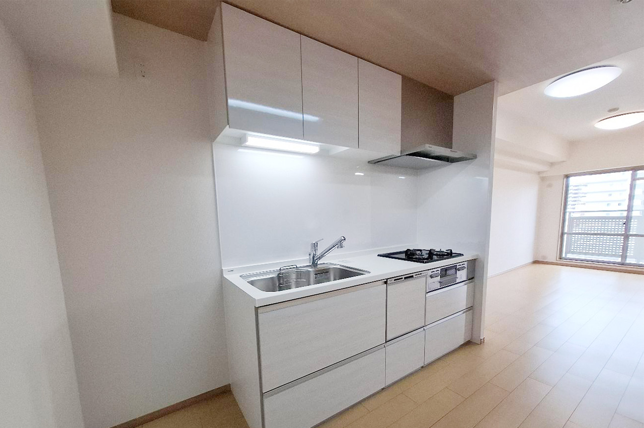 清潔感のあるシステムキッチンを新調済み。リビングの様子を見守りながら調理ができる間取りです。