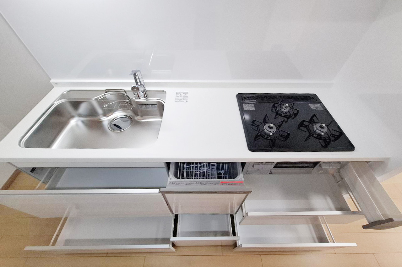 新調した食洗機・浄水器付のシステムキッチンはたっぷり収納で機能的。3口コンロで同時調理もラクラク。