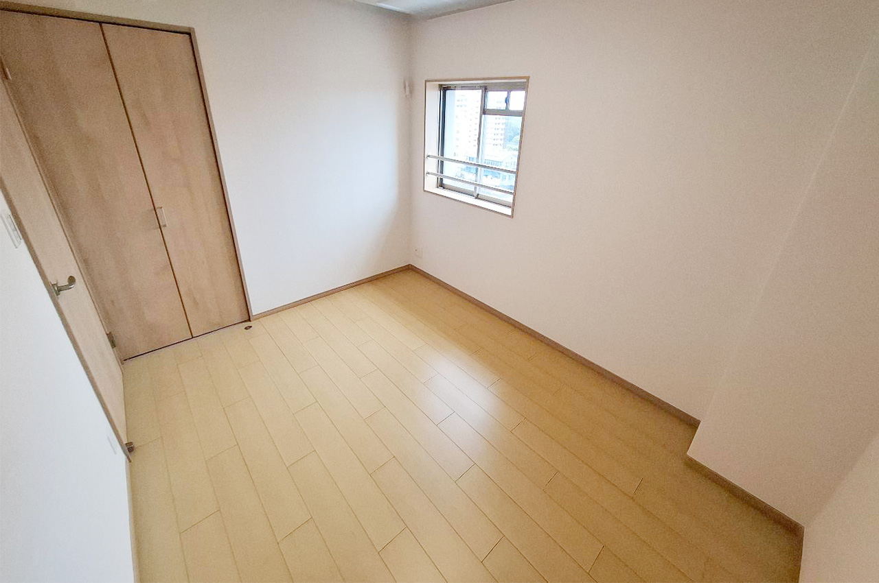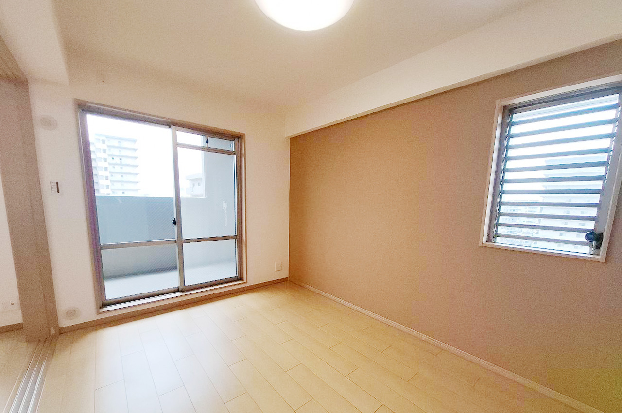 リフォームできれいになった約5帖の洋室。二面採光で明るく風通りも良好です。