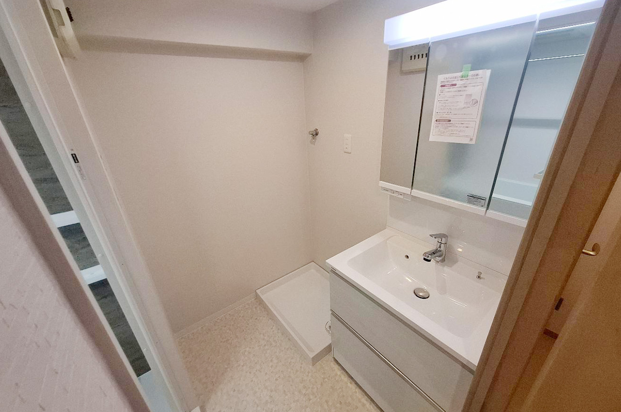 室内洗濯機置き場で家事も効率的。新調済みの洗面台は収納力があり日用品もすっきり。