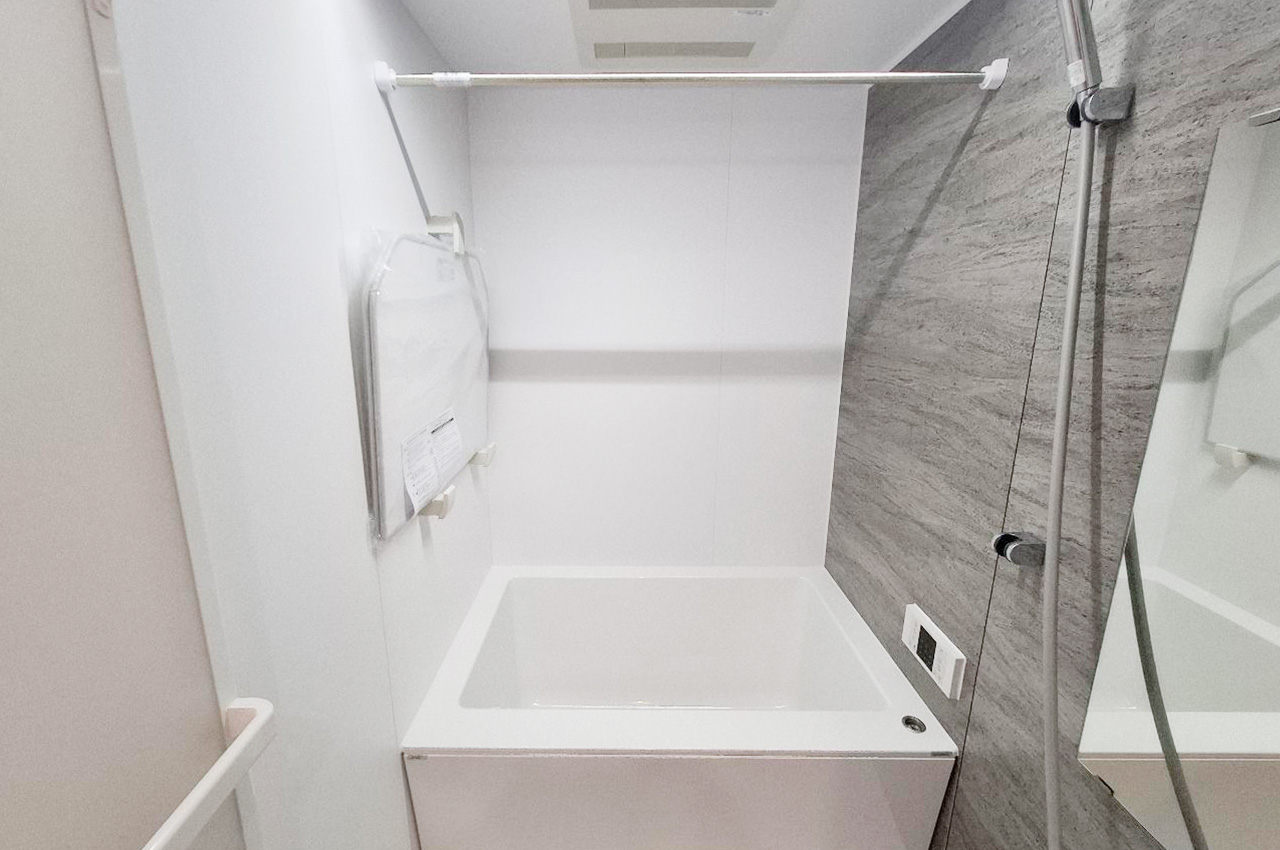 システムバスや浴室乾燥機を新調済み。グレーのパネルがスタイリッシュなバスルームです。