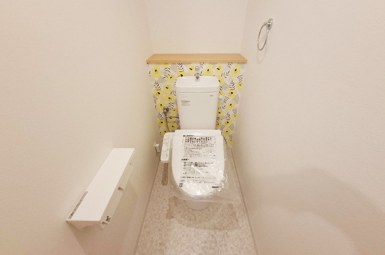 花模様のアクセントクロスが明るい印象を演出。新品設備で気持ちよく利用できます。温水洗浄便座で快適。