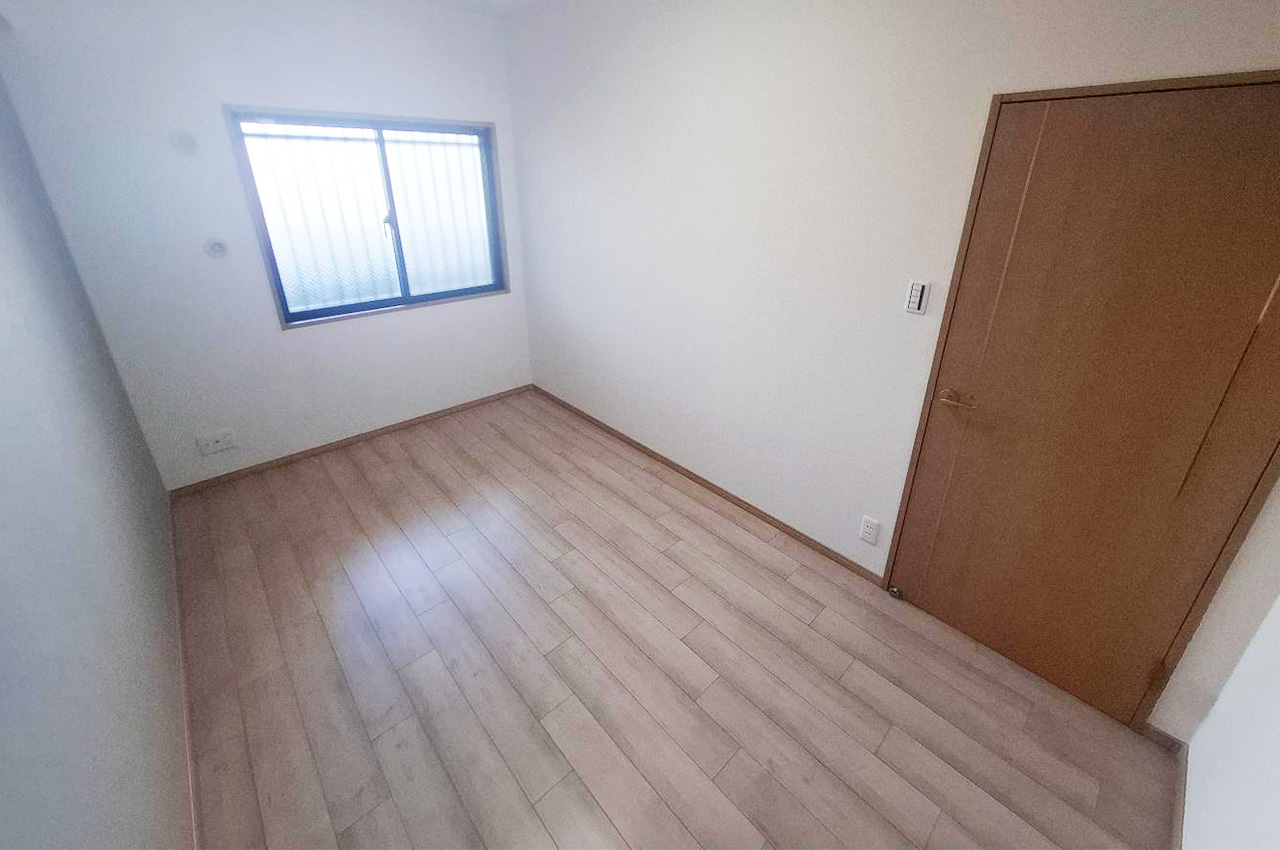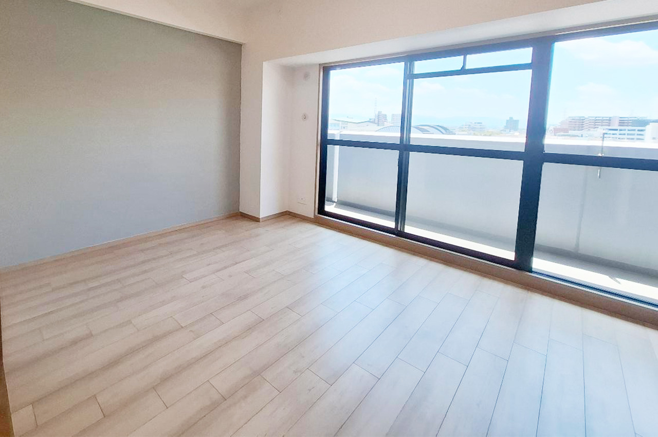 洋室:リフォーム済みのナチュラルな床とグレーのアクセントクロスが調和するシンプルで上質な空間。