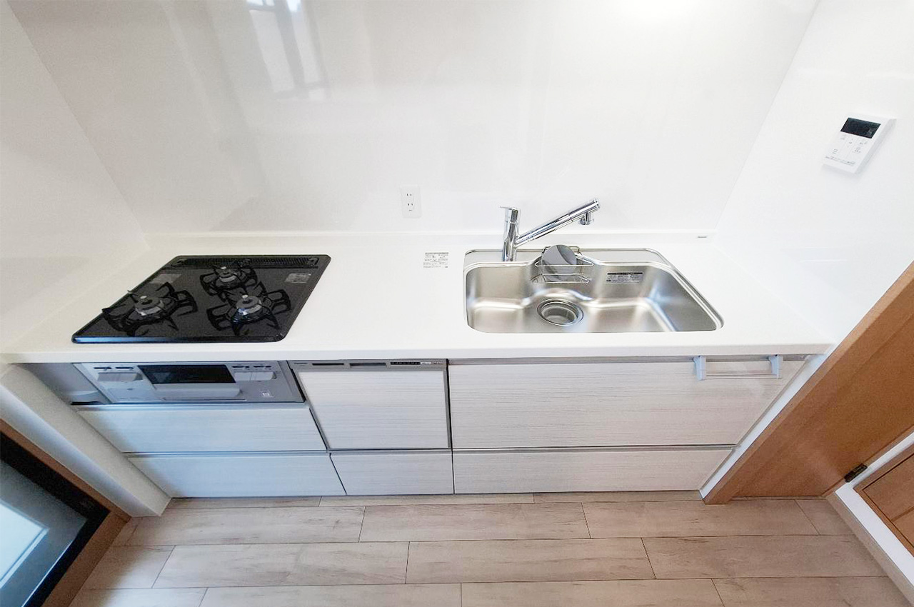キッチン:新調されたシステムキッチンは、清潔感あふれる白基調。食洗機付きで毎日の家事効率アップ。