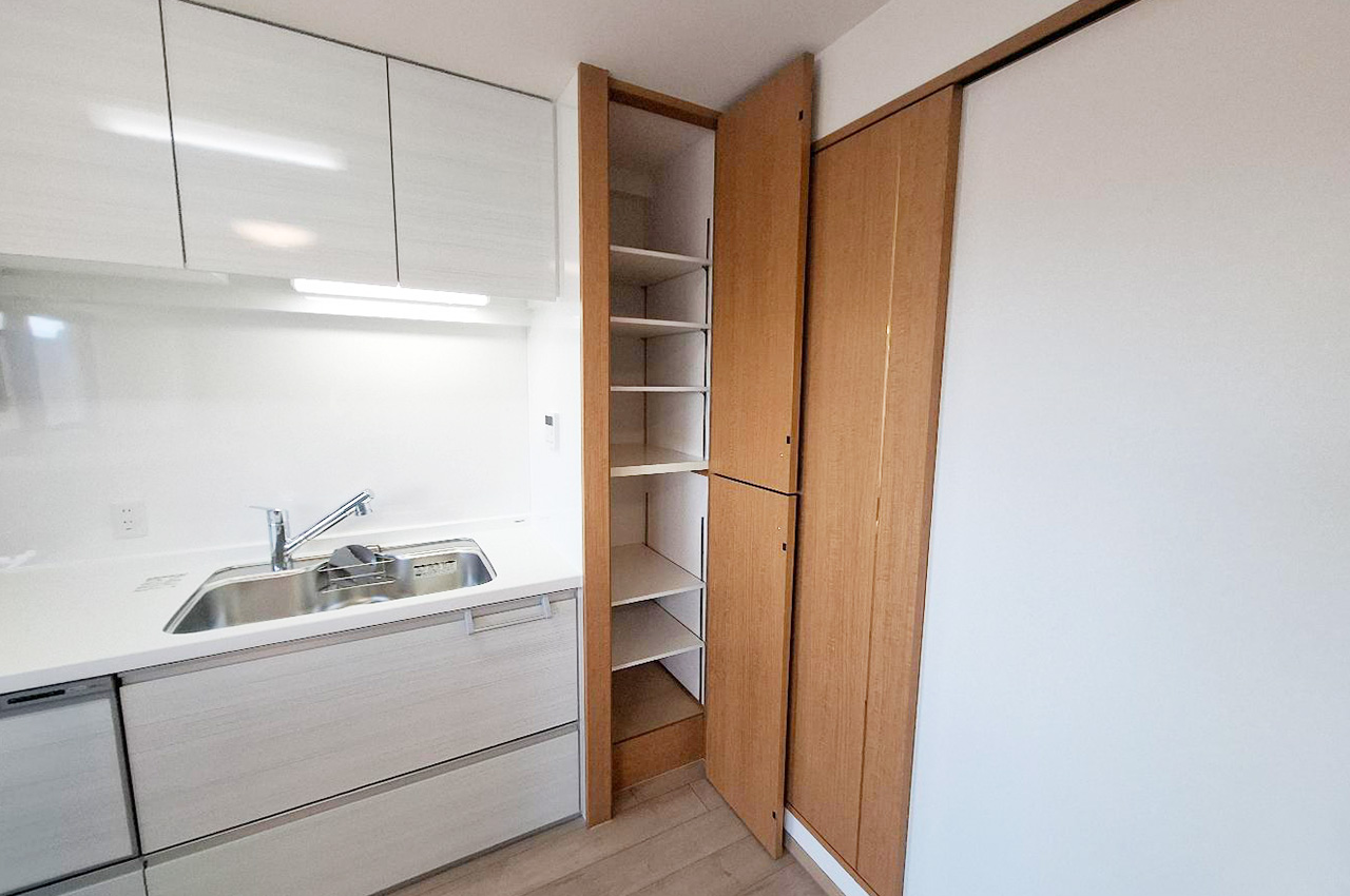 キッチン:システムキッチン横のパントリーを活用すれば、保存食や調理器具もすっきり収まります。