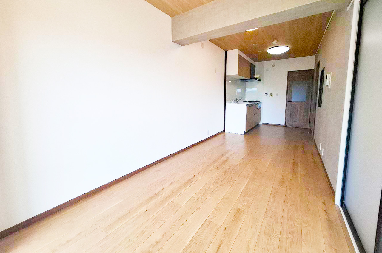 木目調のフローリングと天井が温かみを演出するLDK。家具配置もしやすい長方形の間取りです。