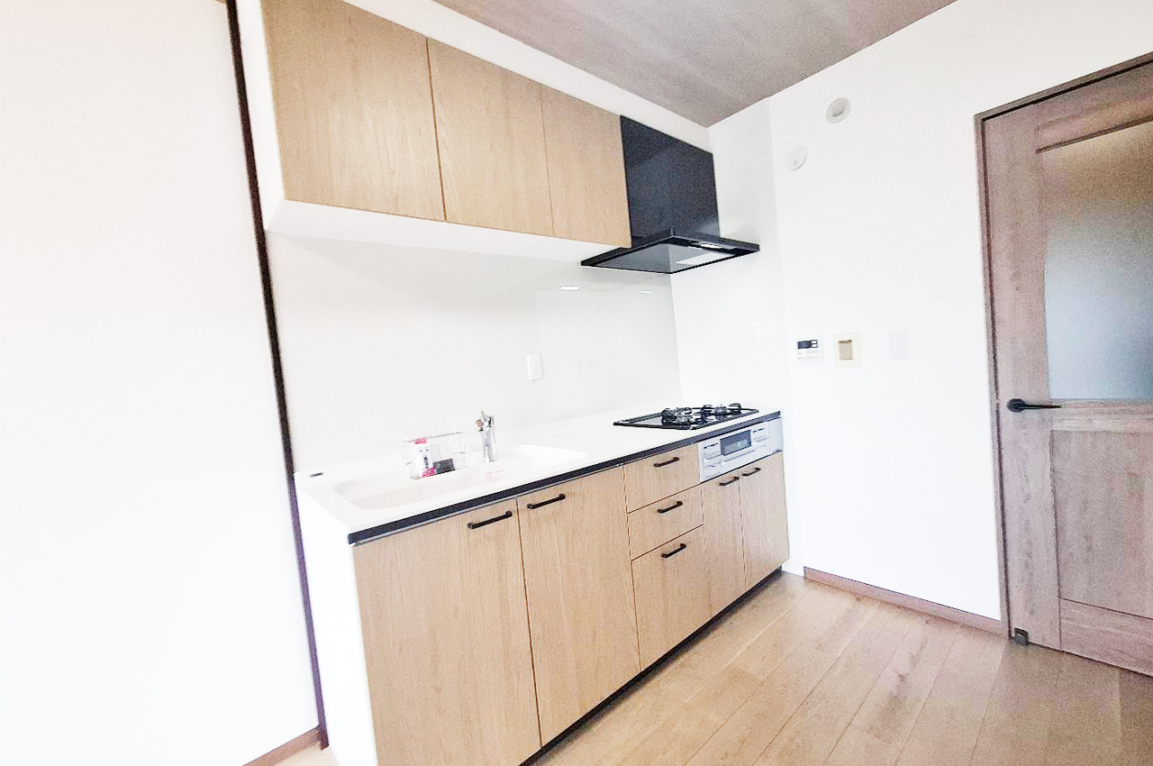 木目調の扉が温かみを演出するシステムキッチン。生活感を抑えたすっきりした空間です。