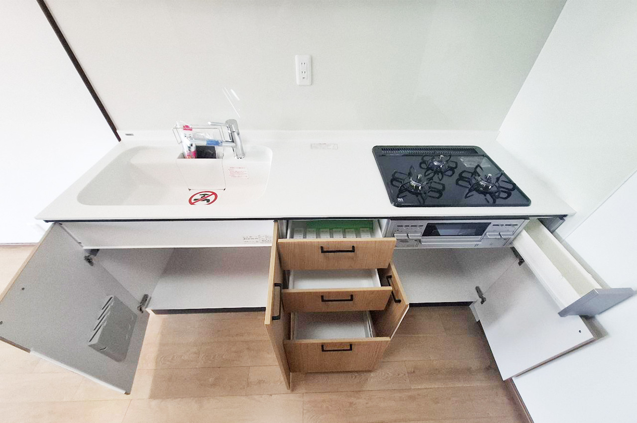 収納力の高いシンプルで機能的なシステムキッチン。食器や調理器具の整理整頓に便利です。