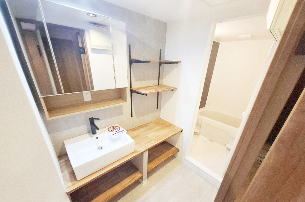 広めのカウンターと大きな鏡、収納棚を備えた洗面台は使いやすく、日常の身支度をスムーズにしてくれます。