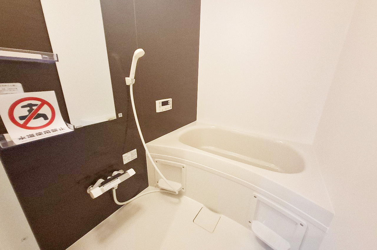 ダークカラーのアクセントパネルがモダンな落ち着いた印象のバスルーム。