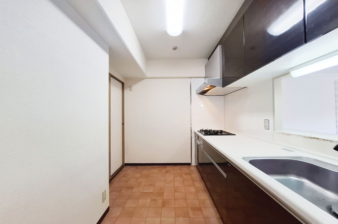 タカラスタンダード製の落ち着いたブラウンのシステムキッチン。