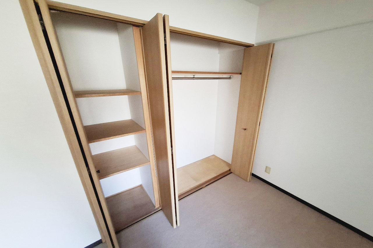 洋室内の棚収納と、ハンガーパイプのあるクローゼットの機能的な収納。