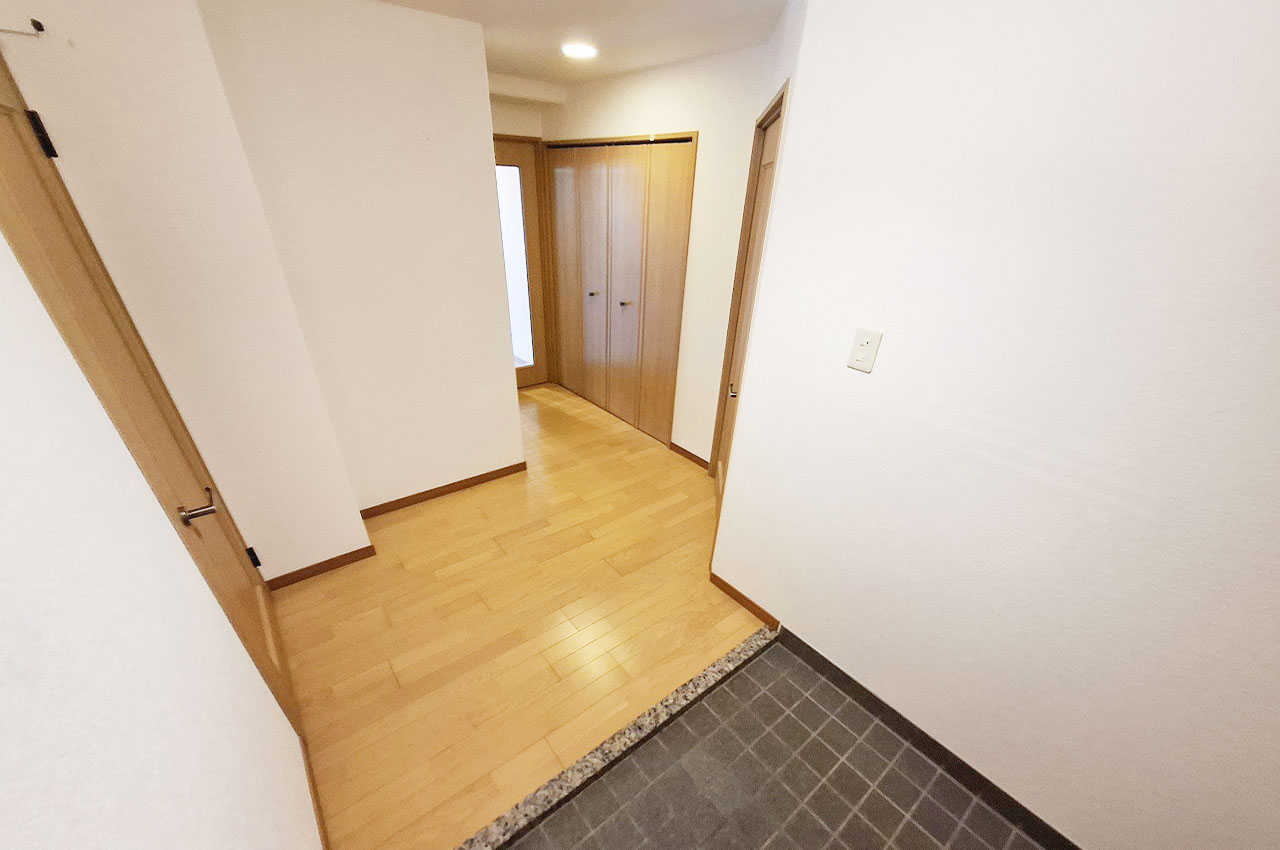 来客から室内への視線をずらす効果のあるレイアウトになった玄関。