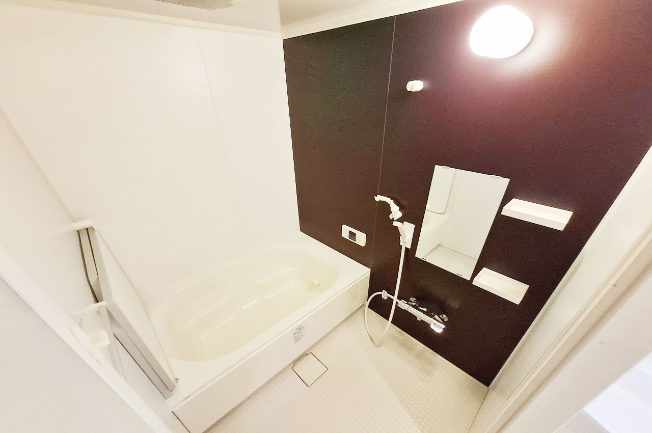 ブラウンのカラーパネルが落ち着いた雰囲気のバスルーム。