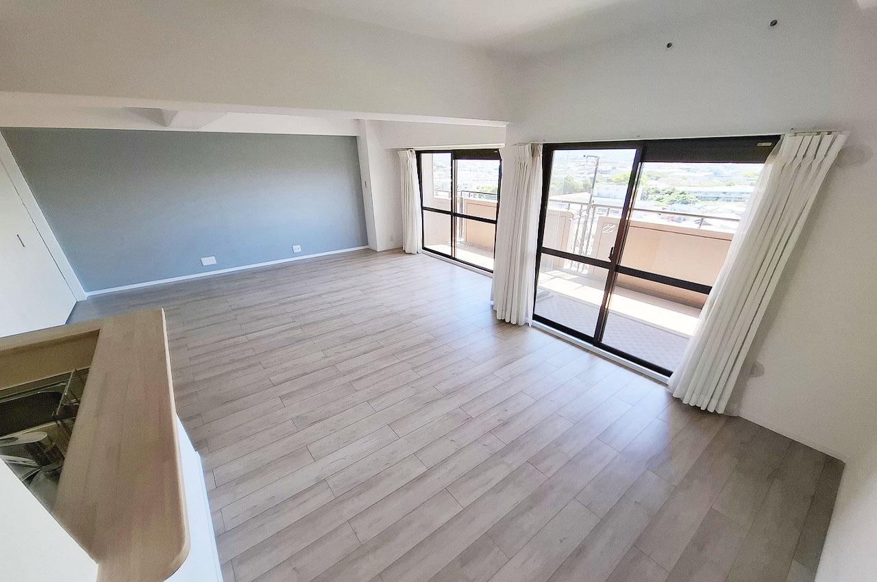 リビングダイニングは南西向きのワイドなバルコニーに面し、明るく開放感があります。